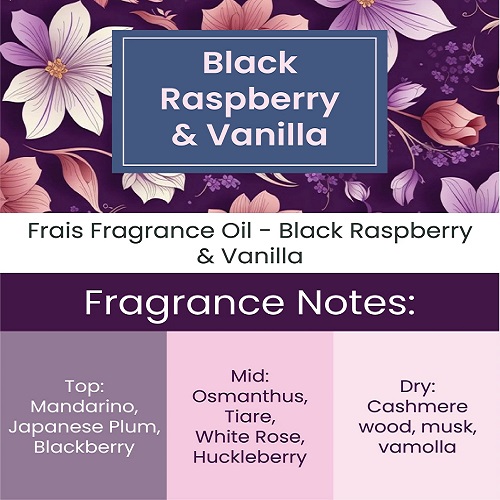 The Black Raspberry & Vanilla Fragrance Oil features a rich composition that begins with top notes of berries and plum, transitions into heart notes of delicate florals, and concludes with a subtle blend of cashmere and vanilla.