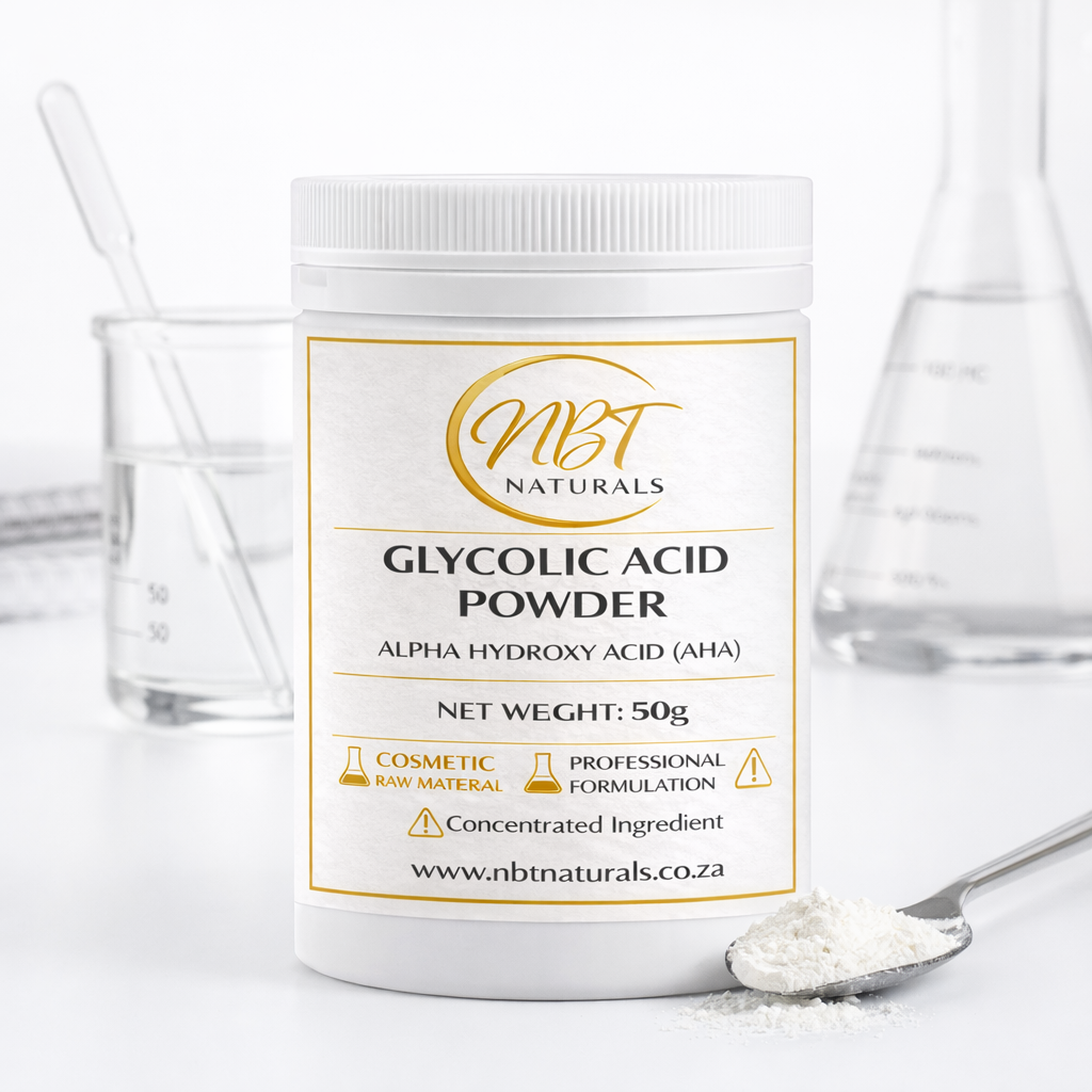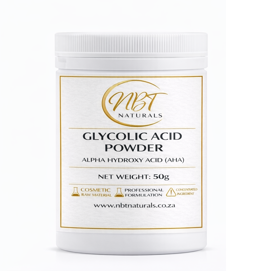 NBT Naturals Glycolic Acid Powder is a high-quality Alpha Hydroxy Acid (AHA) widely used in cosmetic formulations to promote exfoliation and support the skin renewal process. Glycolic acid is one of the most popular exfoliating acids in modern skincare due to its ability to help improve skin texture and enhance the appearance of smoother, brighter skin.