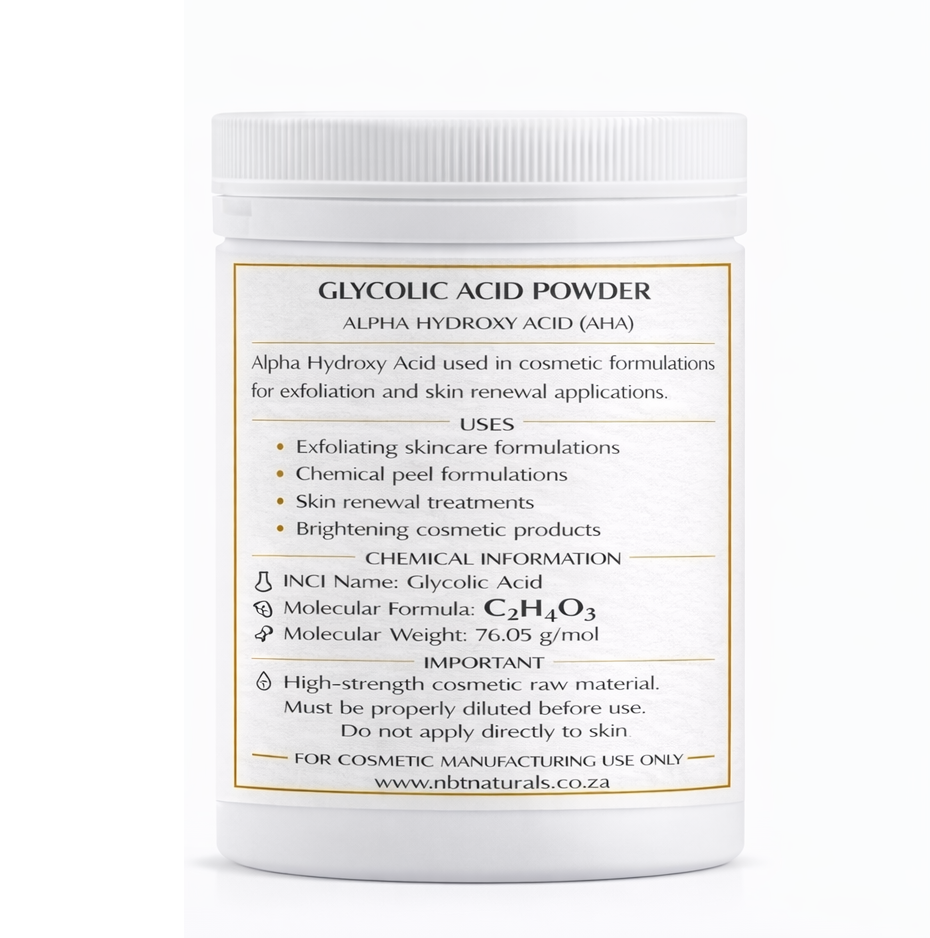 NBT Naturals Glycolic Acid Powder is supplied as a white crystalline powder and is intended for use in cosmetic formulation and professional skincare product development.